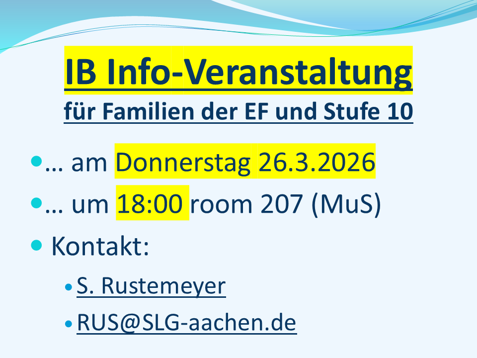 - IB-Koordinatorinnen an St. Leonhard: Frau Rustemeyer (RUS) (und Frau Thelen, THN) – Mail: IB-Koordination@slg-aachen.de oder RUS@SLG-aachen.de